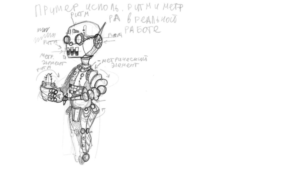 Робот для демонстрации метра и ритма. Да он немного корявый, но «хорошо и прекрасно», а колено высоковато. Да и кожухи можно было получше отрисовать. Но стоит учитывать сорость работы — примерно 40 минут, ведь до этого было сделано задание с композицей.