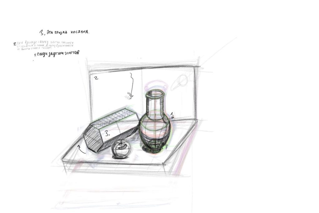 Натюрморт. Вот его я рисовал стоя, потому что, все маленькие мальберты закончились. Надо было кстати сделать фотку, мой планшет на пинах для пробковой доски выглядел весьма брутально.